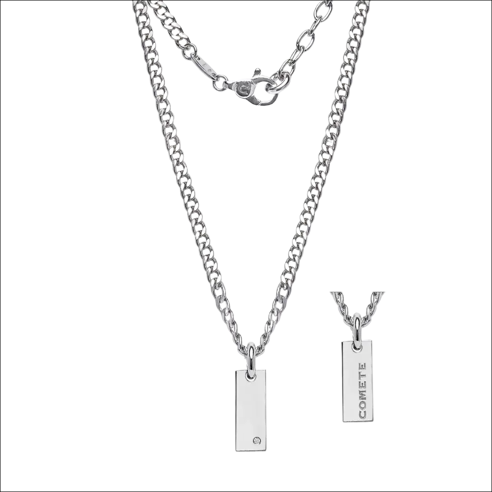 Entdecken Sie das silberne Herrenchoker-Halsband COMETE, das Eleganz und Modernität vereint. Die englische Kette besticht durch ihr robustes und raffiniertes Design und verleiht Ihrem Look eine unverwechselbare Note. Die Plakette mit dem eingefassten Diamanten setzt einen edlen und strahlenden Akzent.