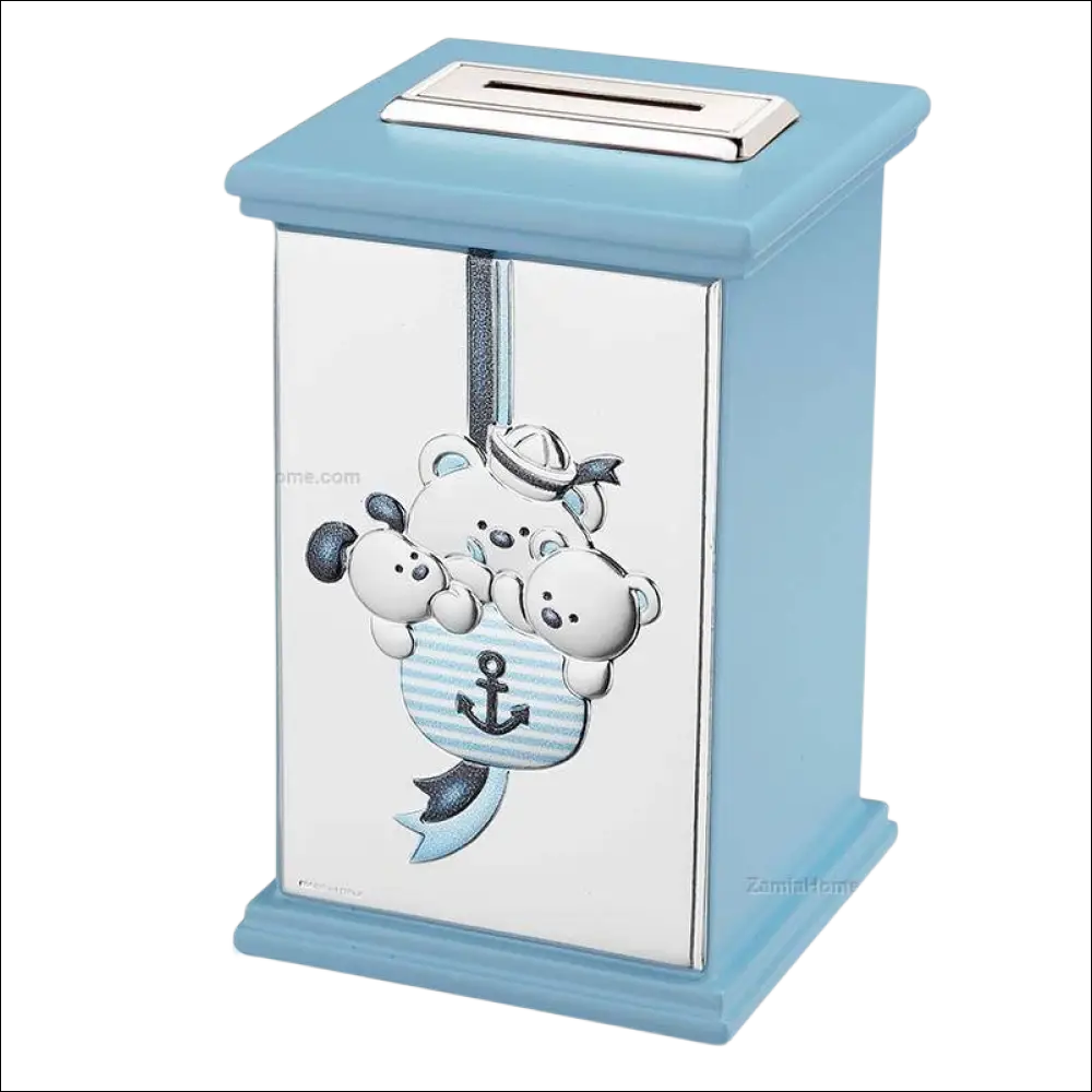 Die Vorderseite dieses hellblauen Sparschweins ziert ein niedlicher Matrosen-Teddybär auf einer silbernen Platte. Oben befindet sich der klassische Einwurfschlitz. Wirft das Kind eine Münze ein, ertönt die fröhliche Melodie der Spieluhr. Um die Musik erneut zu hören, wird das Kind aufgefordert, weitere Münzen einzuwerfen. Dieses spielerische Erlebnis vermittelt spielerisch die Bedeutung des Sparens.