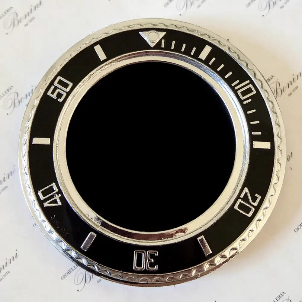 Materiale: Resina con rivestimento di argento puro utilizzando la tecnologia PVD in conformità con le normative di legge, la ghiera è in smalto di colore nero;
