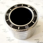 Infatti la superficie superiore riproduce la classica ghiera di quei orologi, in smalto di colore nero, con la scala tachimetrica caratteristica di tanti orologi sportivi.