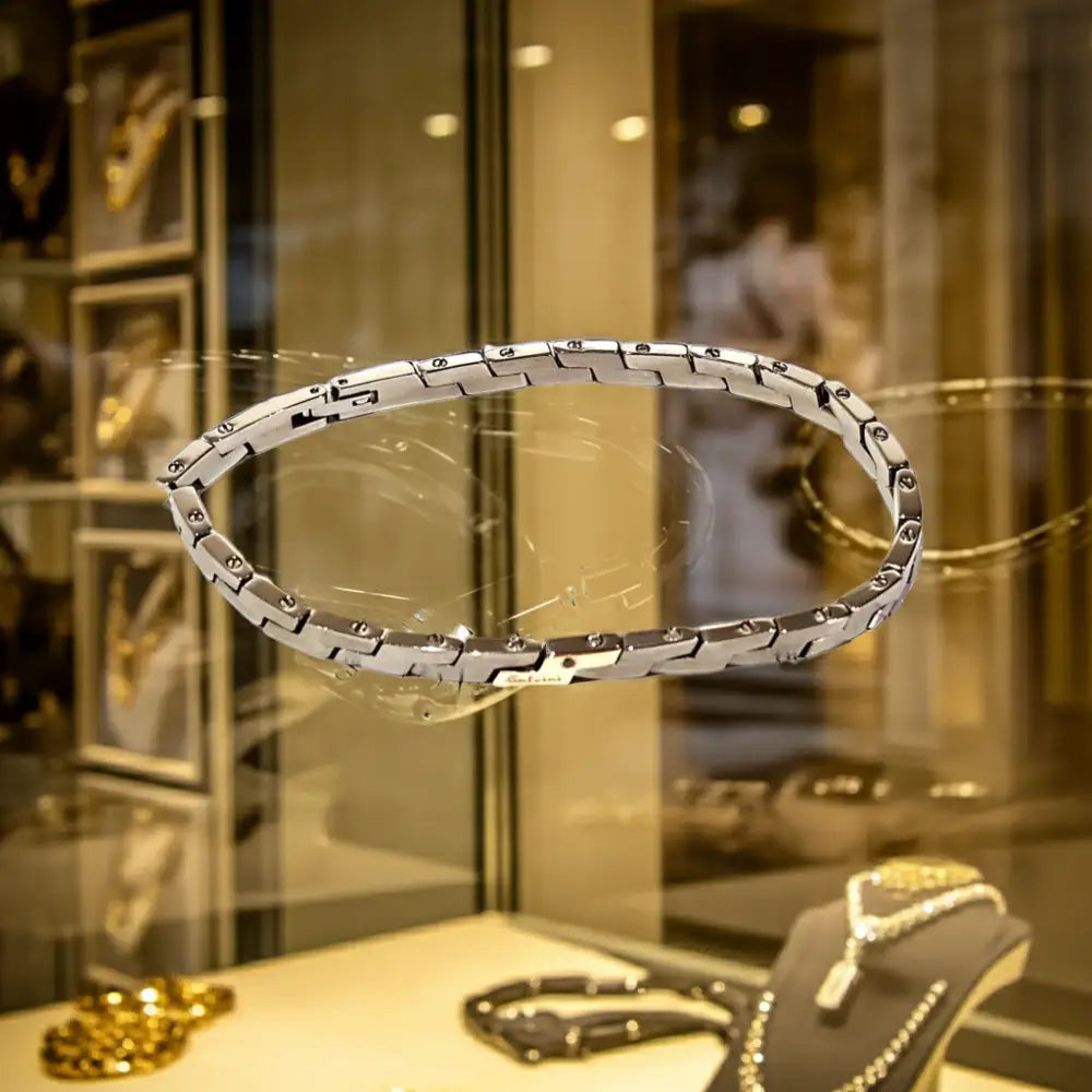 Bracciale uomo che unisce eleganza contemporanea e solidità. Realizzato in titanio e oro rosé 750/1000, questo gioiello della collezione Century di Salvini cattura lo sguardo grazie al diamante black naturale incassato con precisione. Una scelta sofisticata per chi apprezza materiali nobili e design moderno, perfetto per valorizzare lo stile quotidiano con un tocco di lusso discreto e raffinato.