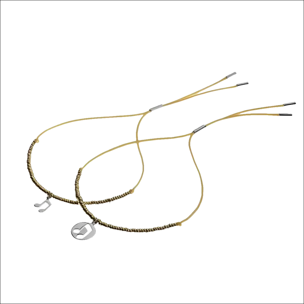 laccetti in cotone cerato con dischetti in bronzo dorato e terminali in bronzo rodiato.