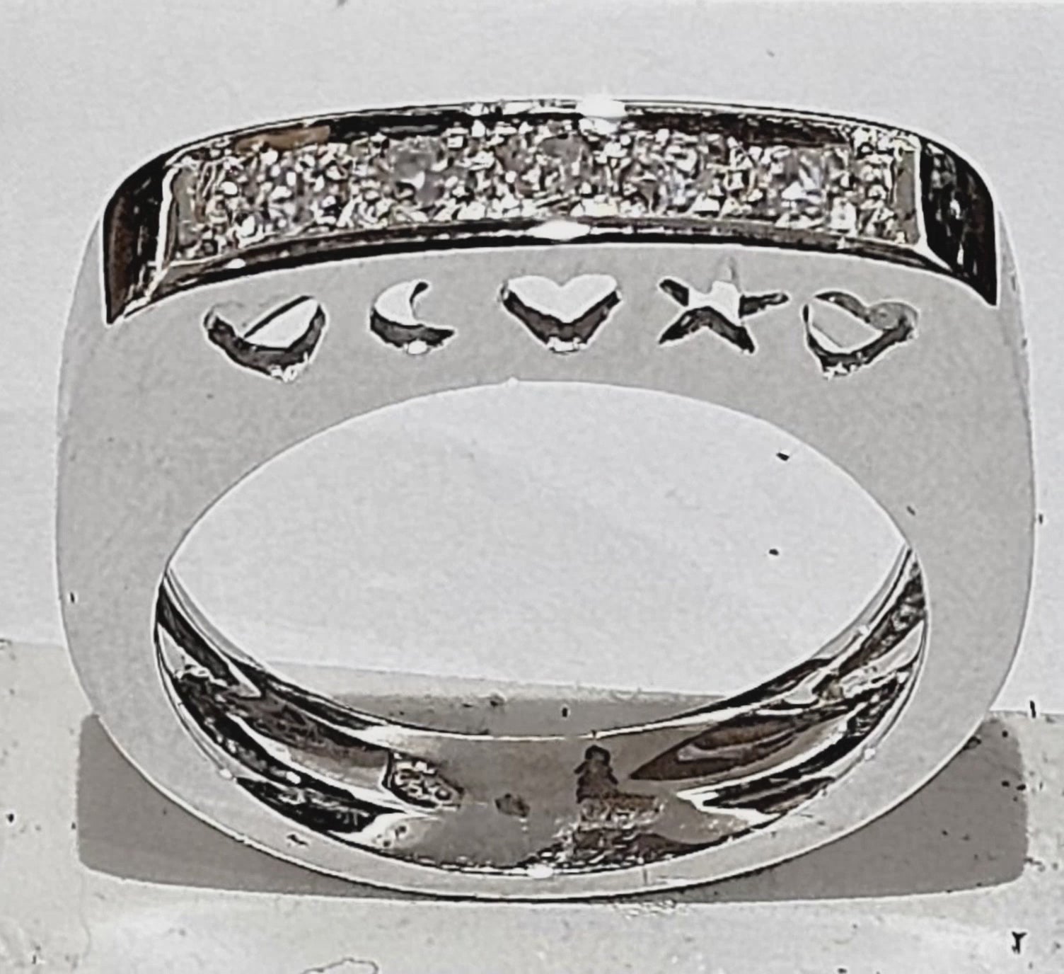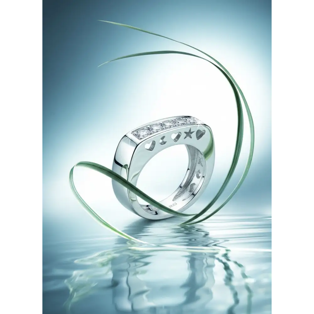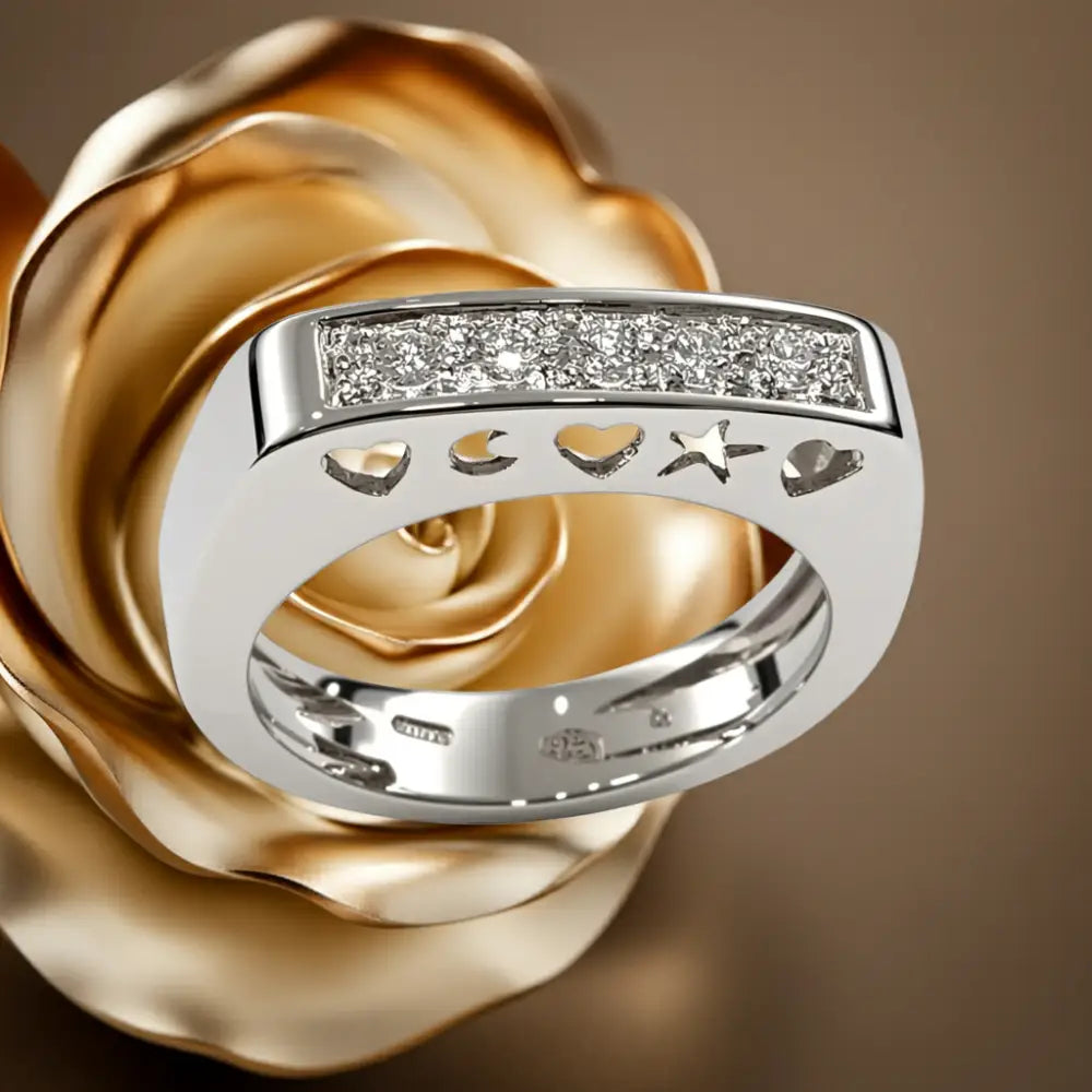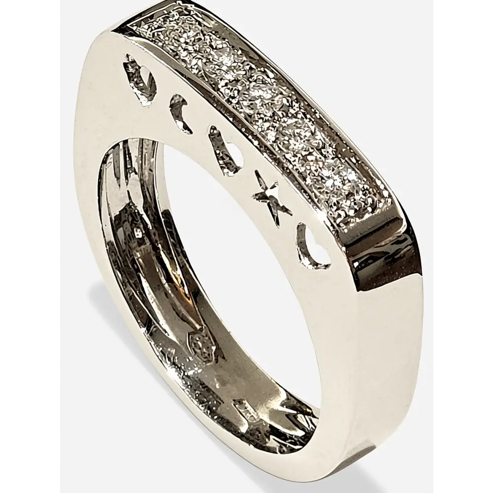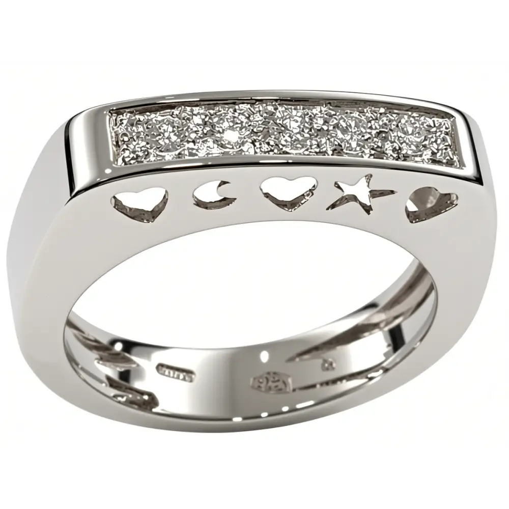 Elegante fedina in oro bianco 750/1000 arricchita da 5 diamanti naturali per un totale di 0,18 carati. La montatura si distingue per i raffinati trafori su entrambi i due lati. Una delicata luna e una stella, intercalate da un cuore, classicissimo simbolo dell'amore, conferiscono movimento e personalità al design. Creazione esclusiva CEVA Gioielli, perfetta come anello di fidanzamento oppure anniversario per chi apprezza l'artigianalità e il significato simbolico di ogni dettaglio.
