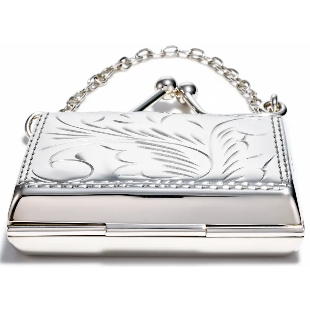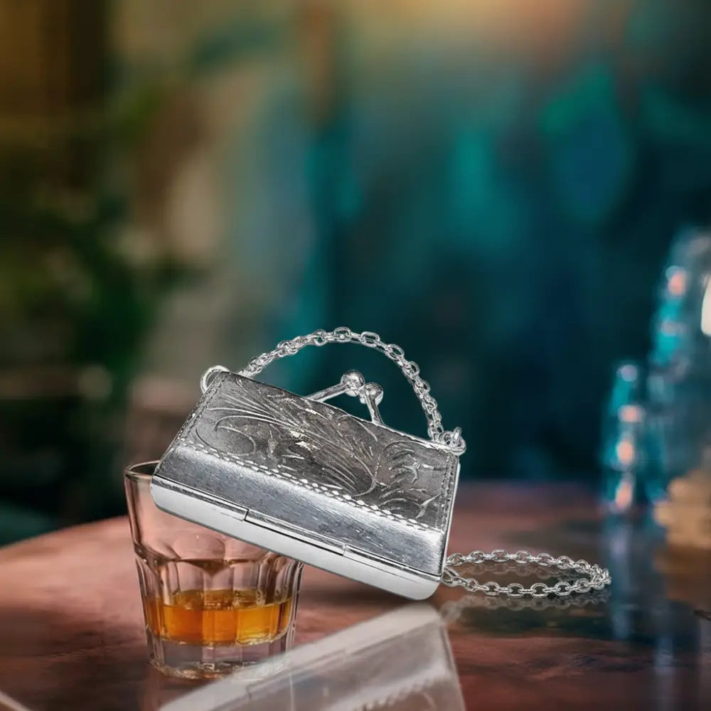 Elegante porta-pastiglie in argento 925/1000 sapientemente lavorato a mano. La forma di borsetta conferisce un tocco di raffinatezza, mentre le incisioni eseguite a bulino creano dettagli unici e personalizzati. Realizzato con la precisione artigianale tipica della gioielleria italiana, questo pezzo unisce funzionalità e bellezza estetica. E' perfetto come accessorio sofisticato per chi apprezza la qualità dei materiali nobili e la maestria del lavoro manuale. Un oggetto che unisce praticità e lusso in un'unica creazione.