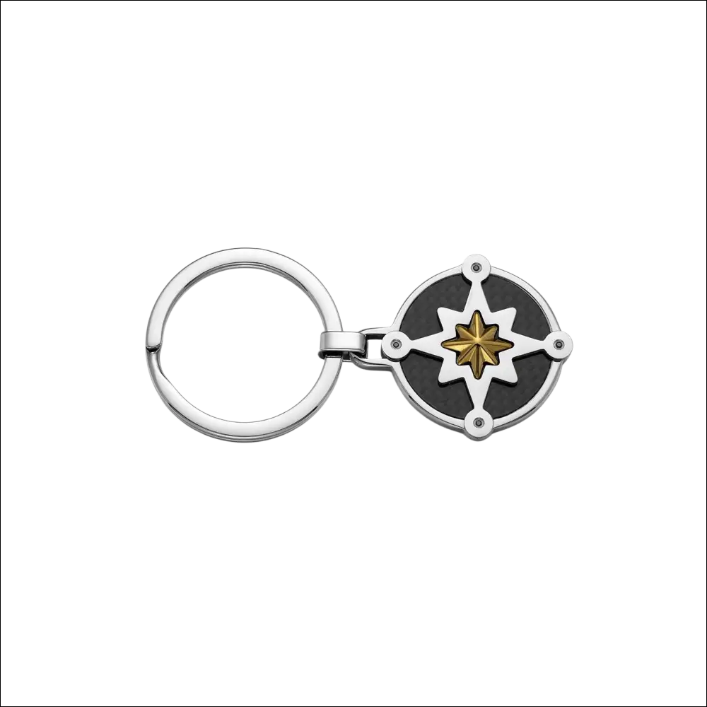 Elegante portachiavi COMETE uomo che unisce stile e raffinatezza. Realizzato in acciaio con dettaglio in PVD giallo e preziosa fibra di carbonio, presenta un classico soggetto come la Rosa dei Venti impreziosito all' estremità da quattro zirconi neri. Un accessorio sofisticato che combina materiali di alta qualità per un look contemporaneo e distintivo, perfetto per l'uomo che cura ogni dettaglio del proprio stile.
